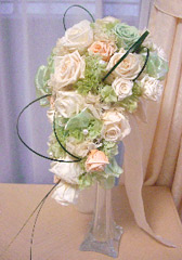 ![]() 淡い色合いでまとめたティアドロップブーケ。 白いドレスに映えて輝くことでしょう。 |